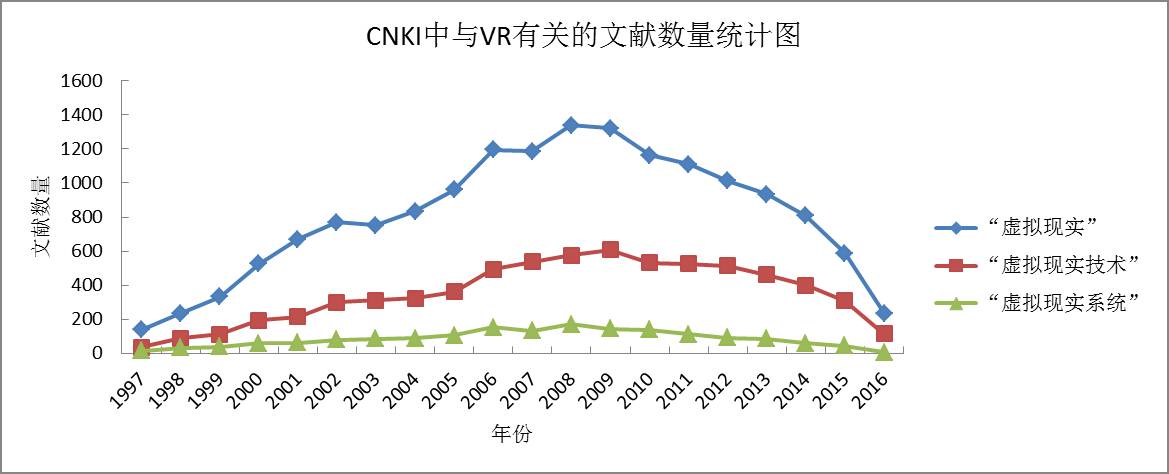 具體操作是這樣的:我們分別以“虛擬現(xiàn)實(shí)”、“虛擬現(xiàn)實(shí)技術(shù)”和“虛擬現(xiàn)實(shí)系統(tǒng)”三個(gè)關(guān)鍵詞在CNKI中進(jìn)行文獻(xiàn)查找,發(fā)現(xiàn)自1993年第一篇有關(guān)VR的文獻(xiàn)在國內(nèi)發(fā)表以來,歷年有關(guān)VR的文獻(xiàn)數(shù)量持續(xù)增加,并在2008年登上它的“珠穆朗瑪峰”,隨后開始走“下山之路”。
