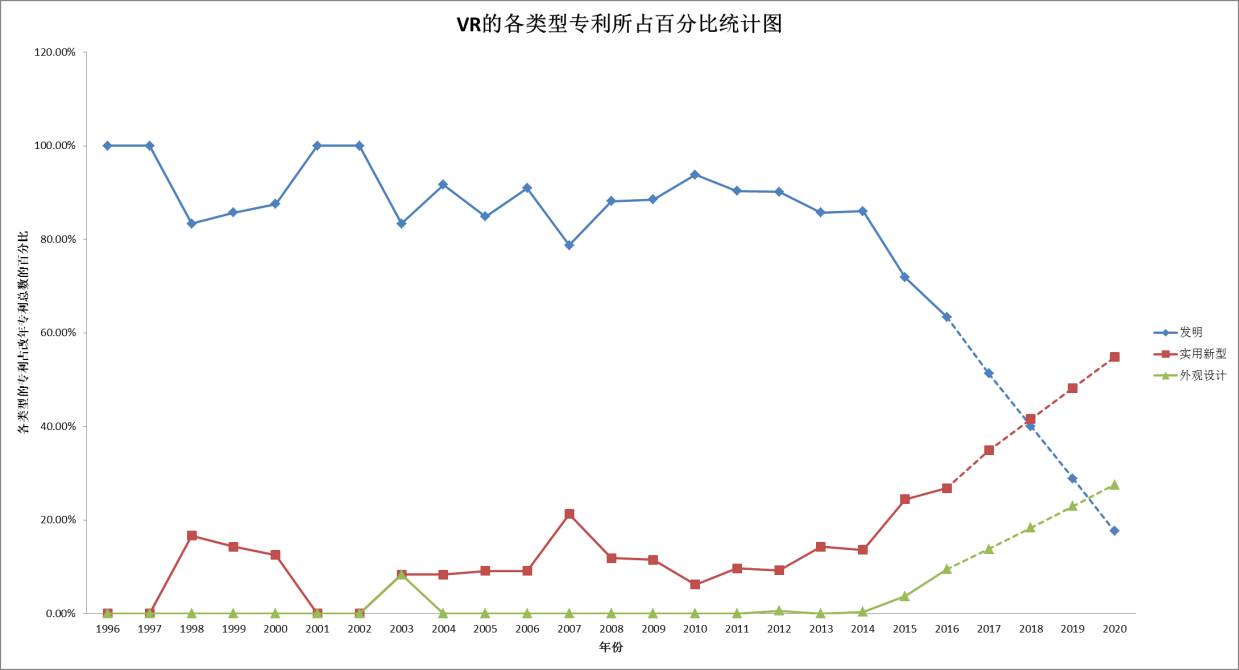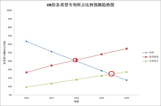 兩個(gè)交叉點(diǎn)揭示:實(shí)用新型和外觀設(shè)計(jì)的專利數(shù)量將于2018和2019年中超過發(fā)明專利數(shù)量。這意味著,從2019年開始,我國與虛擬現(xiàn)實(shí)相關(guān)的專利將以實(shí)用新型和外觀設(shè)計(jì)為主。