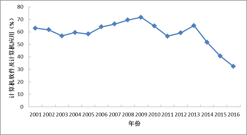 我們又采用另外一個(gè)指標(biāo)驗(yàn)證上述解釋,即虛擬現(xiàn)實(shí)的文獻(xiàn)在各相關(guān)學(xué)科中的分布情況。以計(jì)算機(jī)軟件及計(jì)算機(jī)應(yīng)用學(xué)科為例,2013年之前該學(xué)科的文獻(xiàn)數(shù)量一直居于榜首,所占百分比也都在60%以上。但是,從2009年開始,該學(xué)科的相關(guān)文獻(xiàn)數(shù)量所占比例總體上開始下降,相應(yīng)的,其他應(yīng)用學(xué)科的占比上升。這也說明VR技術(shù)由基礎(chǔ)逐漸轉(zhuǎn)向應(yīng)用。