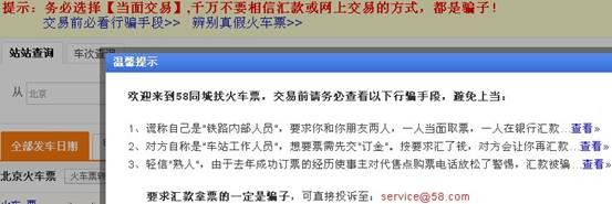 在票務(wù)轉(zhuǎn)讓市場(chǎng)中,分類信息網(wǎng)站的信息內(nèi)容占到很大比重。作為提供這一平臺(tái)的網(wǎng)站運(yùn)營(yíng)者來說,嚴(yán)把審核關(guān),從第一步開始過濾掉伺機(jī)行騙的不法分子信息,可以使用戶交易安全得到初步保證。登陸58同城網(wǎng)瀏覽票務(wù)信息(http://bj.58.com/piaowu.shtml)的用戶會(huì)發(fā)現(xiàn),在查詢票務(wù)內(nèi)容之前,網(wǎng)站會(huì)彈出頁(yè)面提示,對(duì)于交易安全有較為詳細(xì)的提醒。其中包括分析行騙手段、辨別真假車票等內(nèi)容。用戶在登陸時(shí)預(yù)先瀏覽下網(wǎng)站中的“溫馨提示”,會(huì)為自己順利“淘票”提供很大幫助。