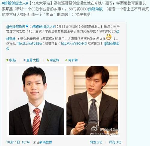 10月13日,“創(chuàng)業(yè)邦”雜志官方微博中發(fā)出關于“北京大學高校巡講”的消息,58同城姚勁波,以一個技術人才+青年創(chuàng)業(yè)者的身份,參加到這個創(chuàng)業(yè)課堂中,并擔任嘉賓,并發(fā)表主題演講。