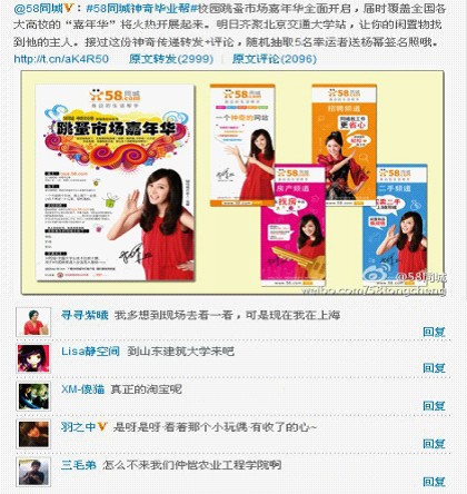 6月10日,58同城神奇畢業(yè)幫·跳蚤市場嘉年華“神奇幫”傳遞在微博引起關(guān)注。覆蓋全國25個城市近百所高校的嘉年華活動,一經(jīng)微博爆出,引來大批網(wǎng)友的關(guān)注和參與。
