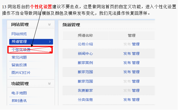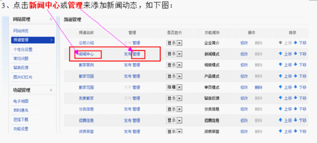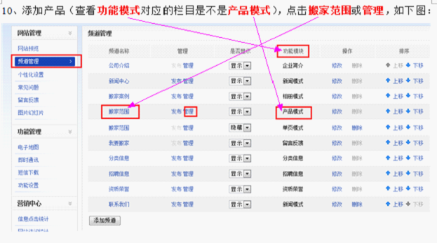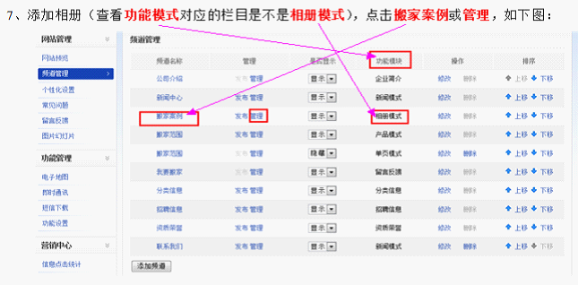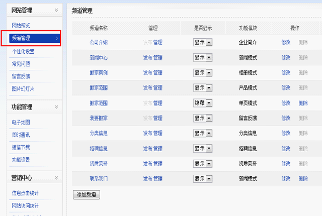 2、點(diǎn)擊頻道管理,網(wǎng)站欄目的操作都是在頻道管理。如下圖:
